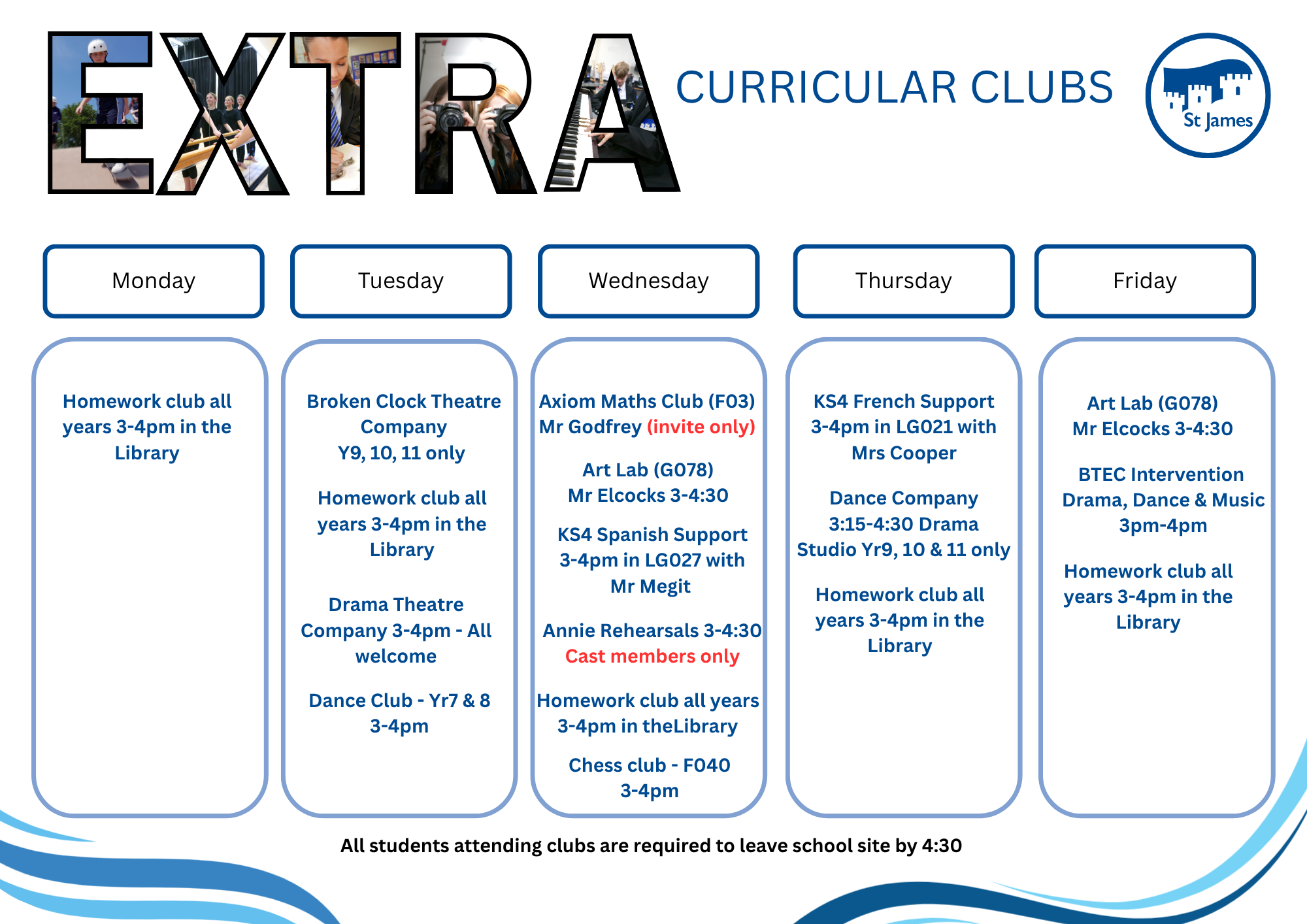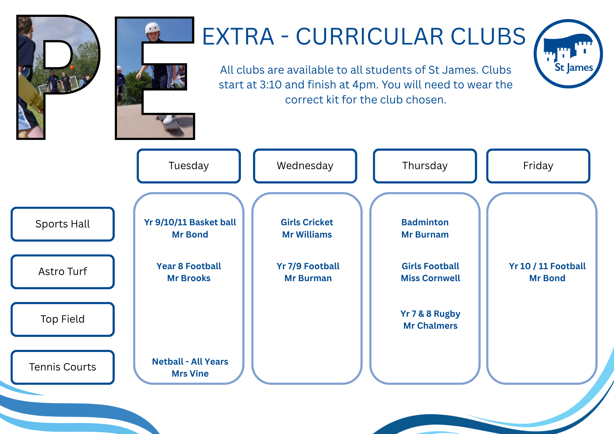 Here at St James we promote all students to participate in Extra Curricular clubs to learn new skills, meet new friends and thrive through a postive learning culture.